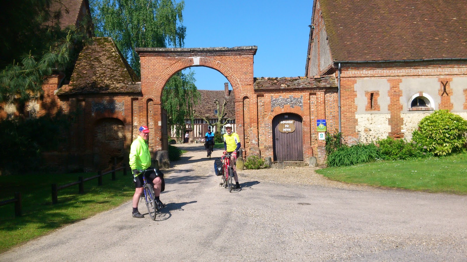 Domaine du Patis in Amecourt. Pretty steep hill but once at he top it was all along the ridge for miles. The place was amazing, a working XII century farm which, given the clear blue skies, looking very impressive. Stored bikes, showered and sat in comfy seats in the garden, the only downside was a persistent dog who just wanted to play. Our evening meal was what we had carried around most of the day and was taken in the main section of our accommodation building.